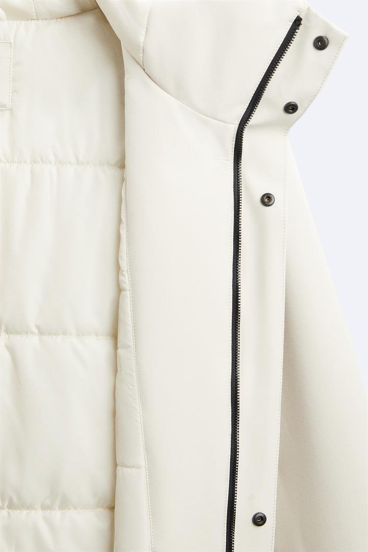 Áo khoác vải kỹ thuật, may chần bông bên trong. Cổ cao, kèm mũ trùm đầu điều chỉnh được. Dài tay, cổ tay bo vải gân bên trong. Có túi đáp hai bên hông. Một túi ở lớp vải lót bên trong. Gấu điều chỉnh bằng dây rút co giãn ở hai bên. Cài phía trước bằng khóa kéo và khuy bấm ẩn.