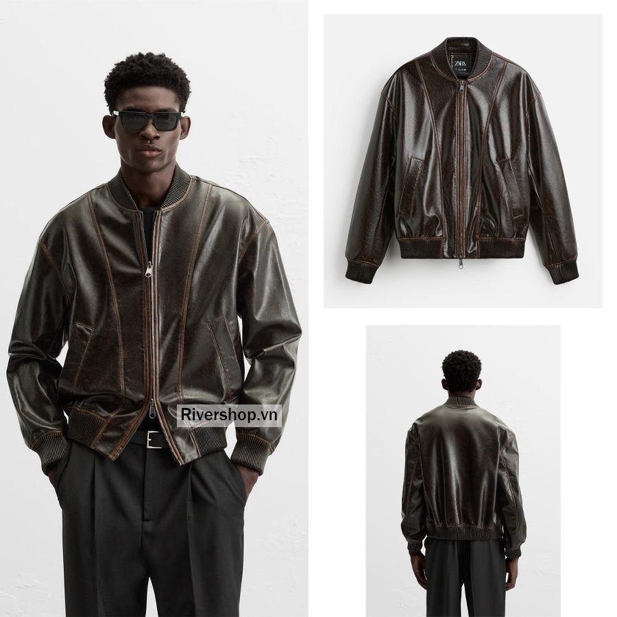Áo khoác chất liệu giả da. Cổ bo viền bằng vải gân co giãn, dài tay. Có túi may viền hai bên hông. Gấu bo thun co giãn. Cài phía trước bằng khóa kéo.