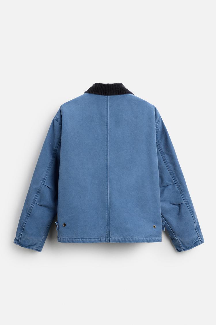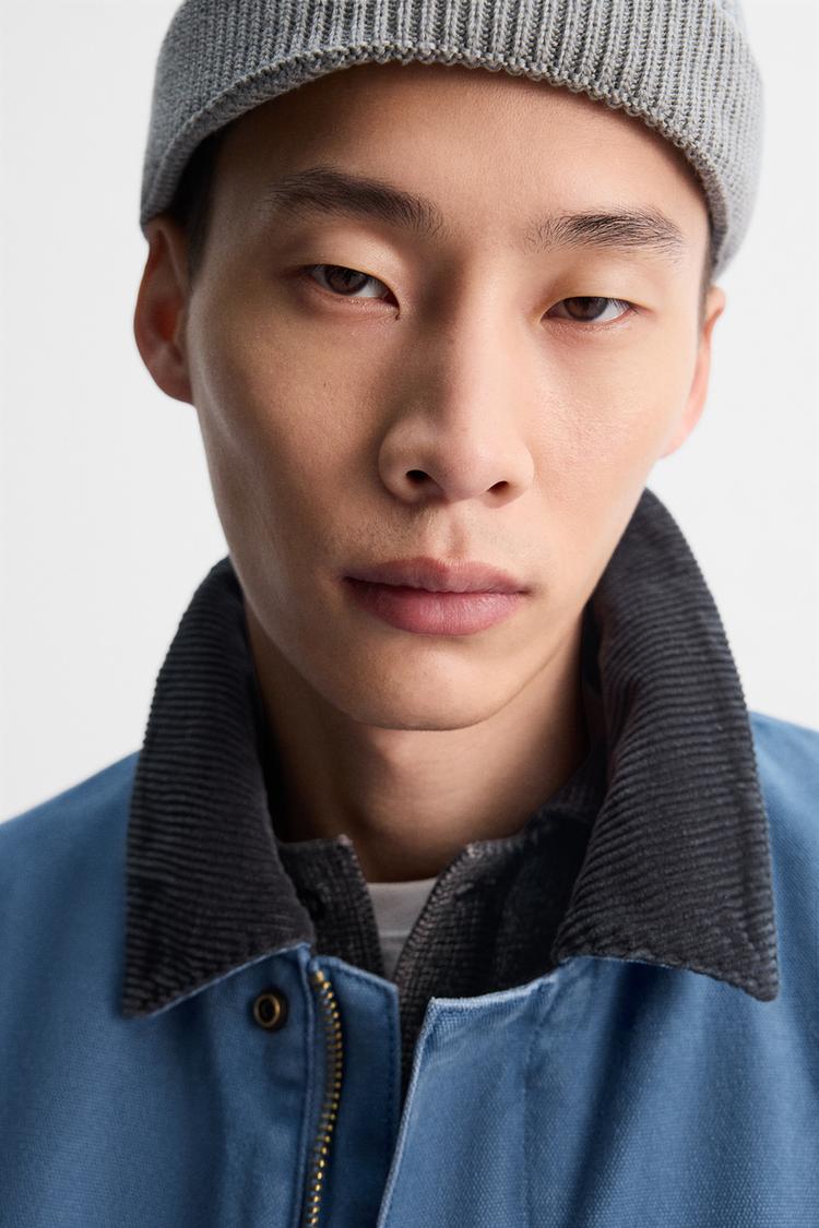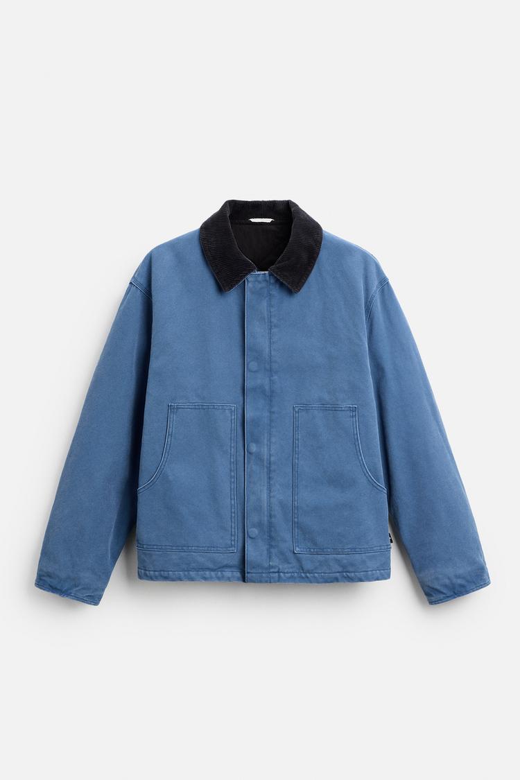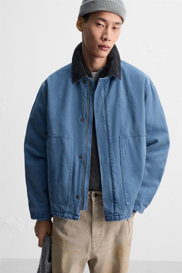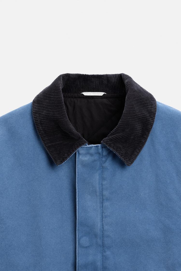 - Áo chất liệu bề mặt vải denim dầy dạn 100% cotton, mặt trong trần bông trám với lớp lót dù có thành phần chất liệu 65% polyester RSC - 35% cotton . Cổ áo phối vải nhung màu đen xanh tạo điểm nhấn