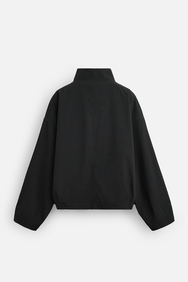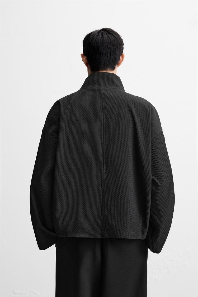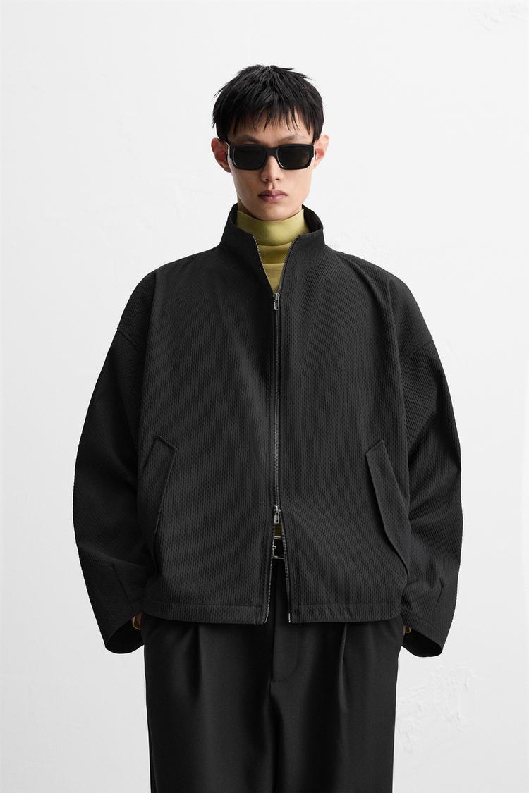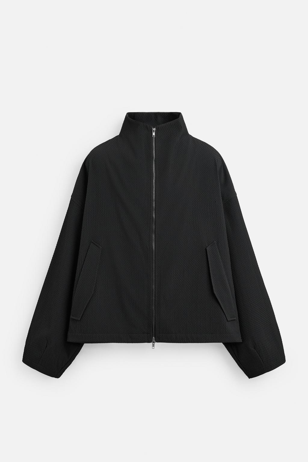 Áo khoác chất liệu vải có vân nổi trên bề mặt, dáng boxy fit. Cổ cao, dài tay, cổ tay bo và có cài khuy. Túi 2 bên hông có nắp. Cài phía trước bằng khóa kéo.