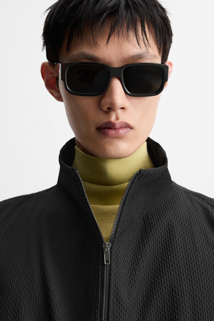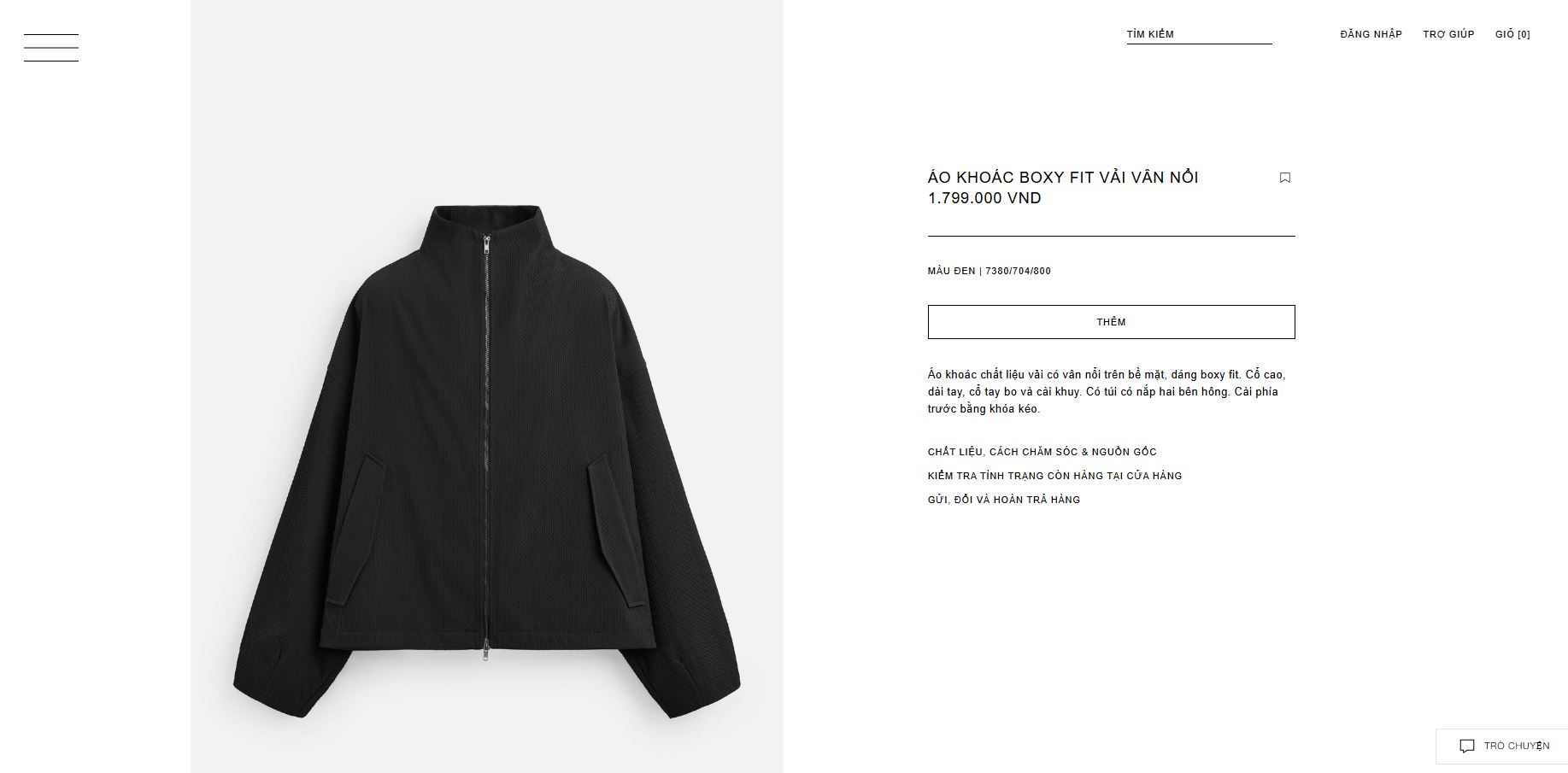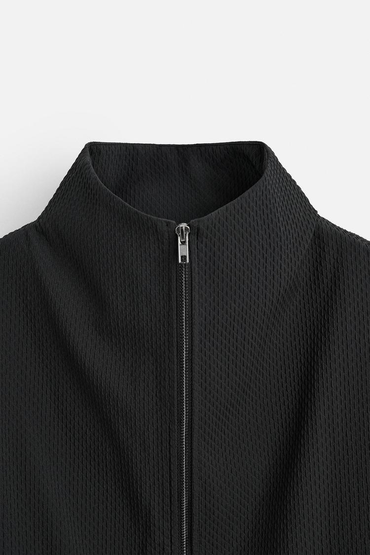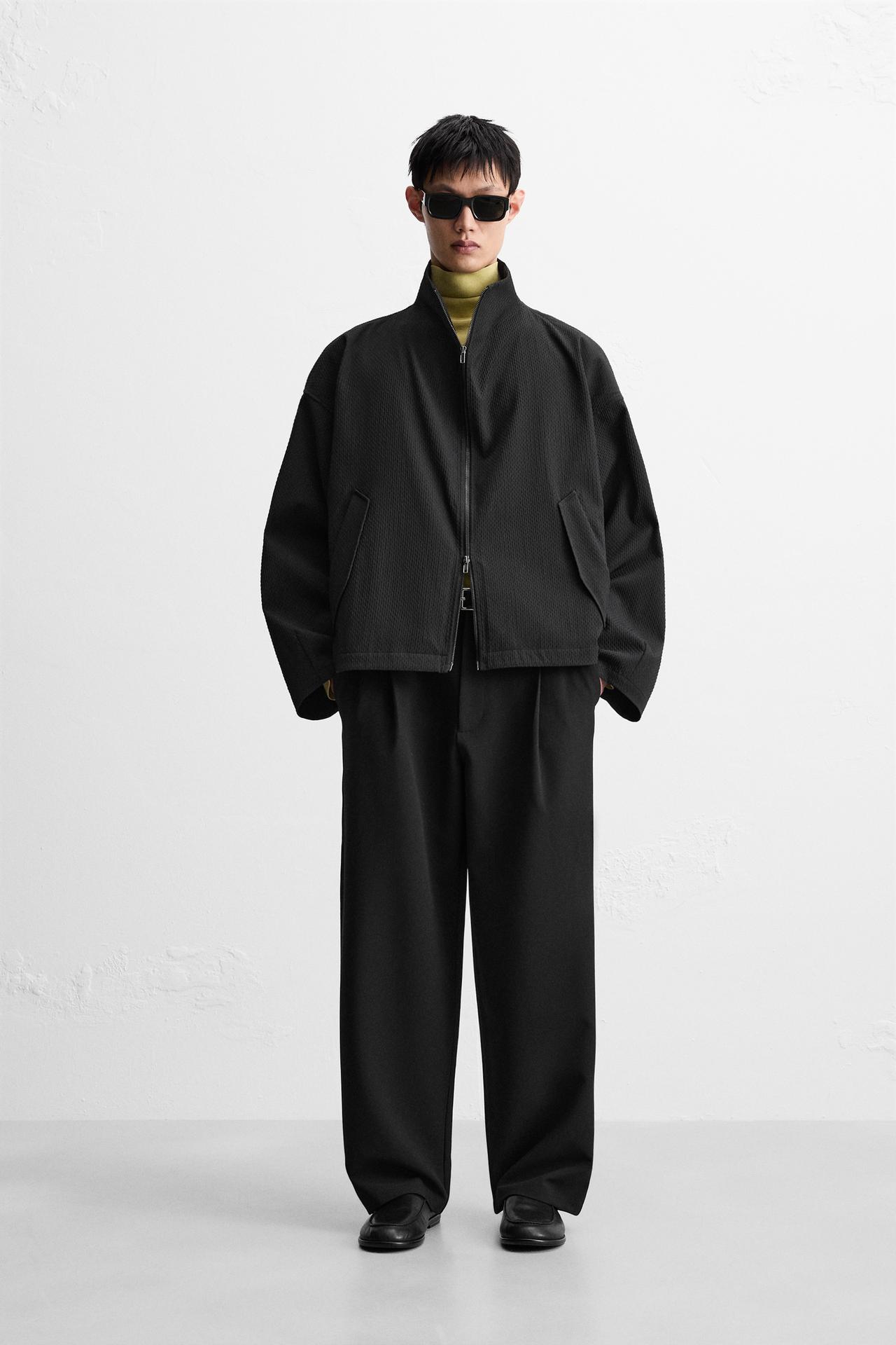 Áo khoác chất liệu vải có vân nổi trên bề mặt, dáng boxy fit. Cổ cao, dài tay, cổ tay bo và có cài khuy. Túi 2 bên hông có nắp. Cài phía trước bằng khóa kéo.