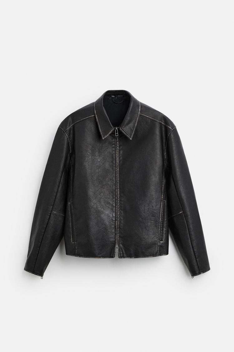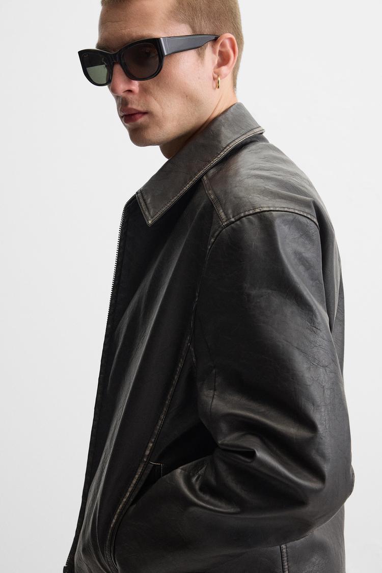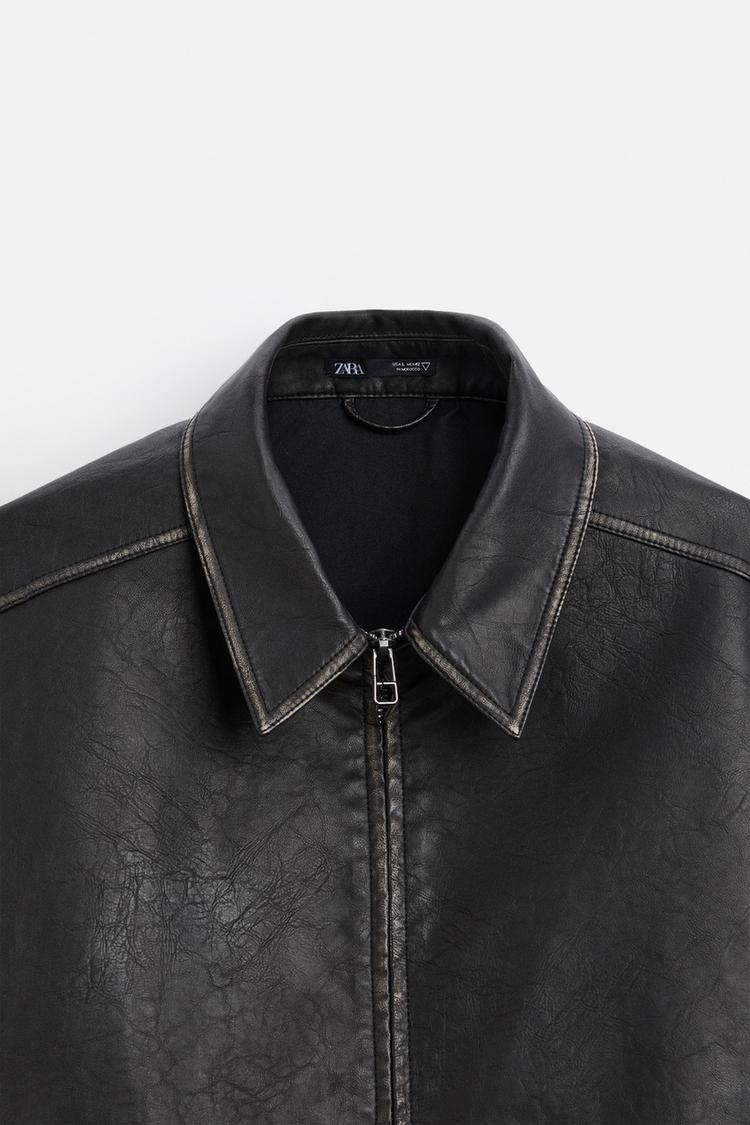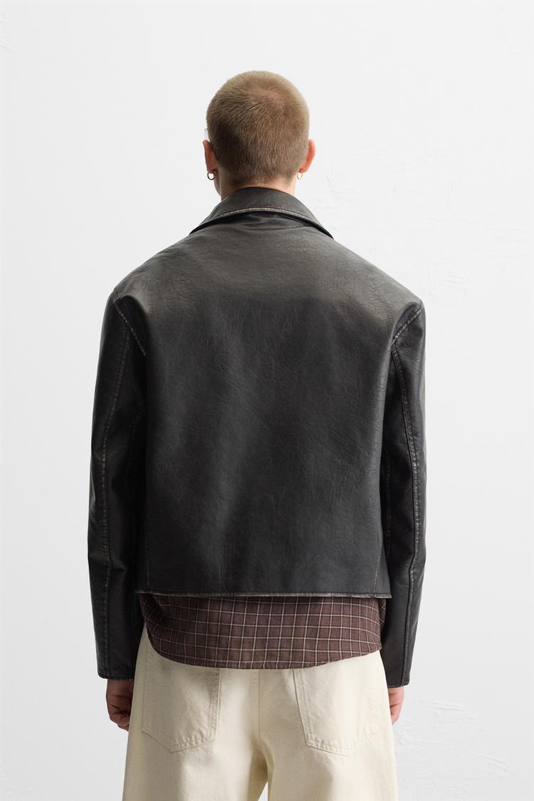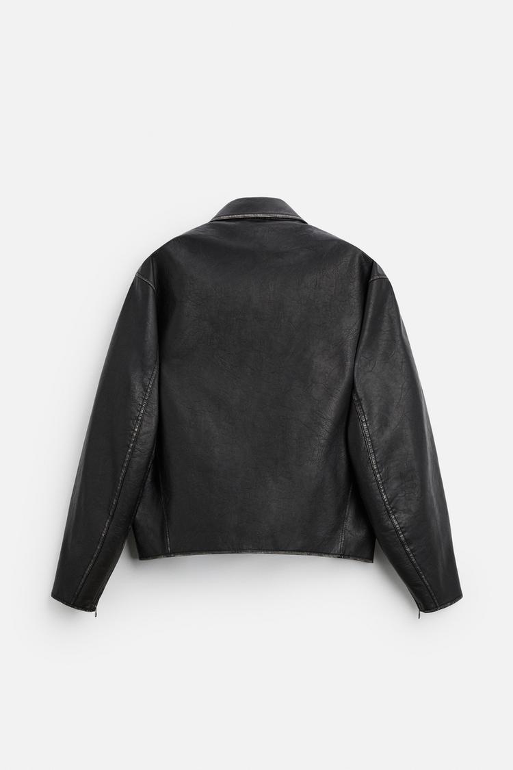 Áo khoác dáng crop, chất liệu giả da. Cổ ve lật, dài tay, có khóa kéo ở cổ tay để điều chỉnh. Có túi may viền hai bên hông và một túi ở lớp vải lót bên trong. Sử dụng khóa kéo phía trước.