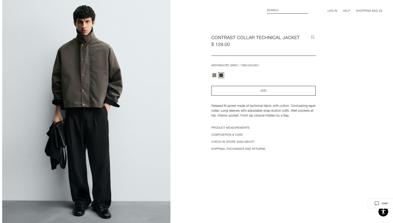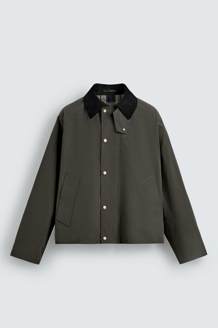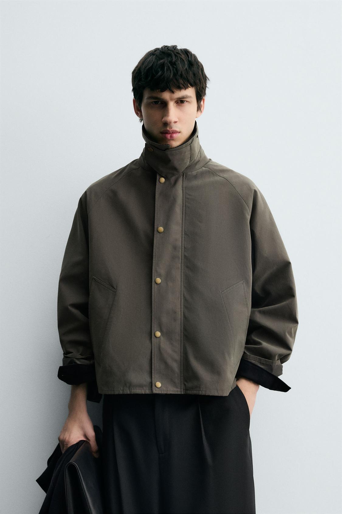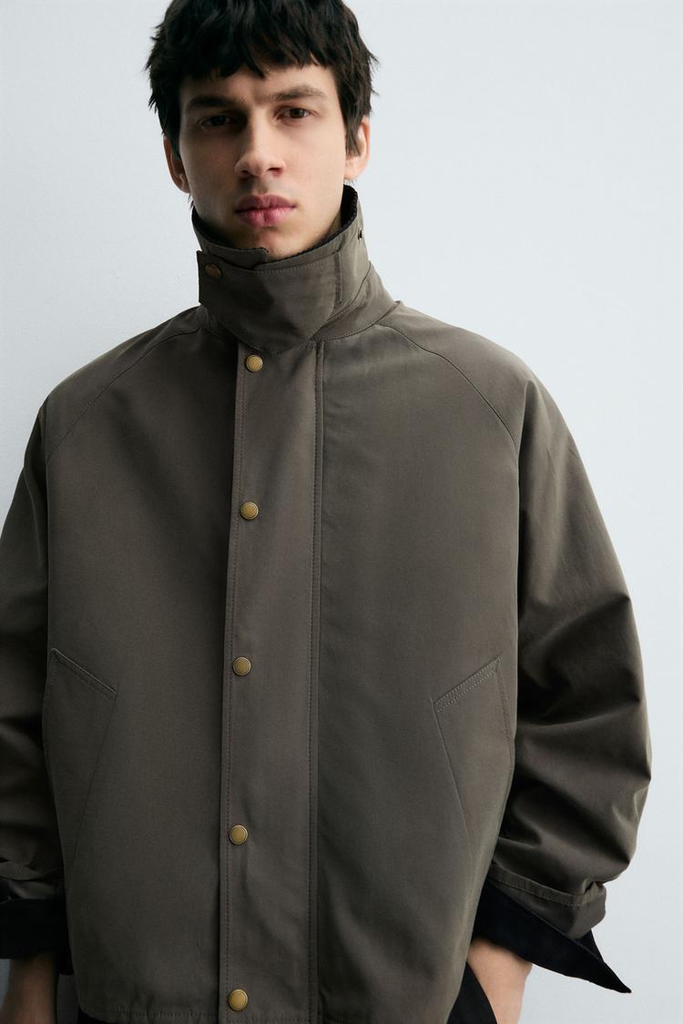 Áo khoác dáng rộng làm từ vải kỹ thuật pha cotton. Cổ ve lật phối màu tương phản. Dài tay, cổ tay điều chỉnh được bằng khuy bấm. Có túi may viền hai bên hông. Có túi bên trong. Cài phía trước bằng khóa kéo ẩn dưới vạt che.