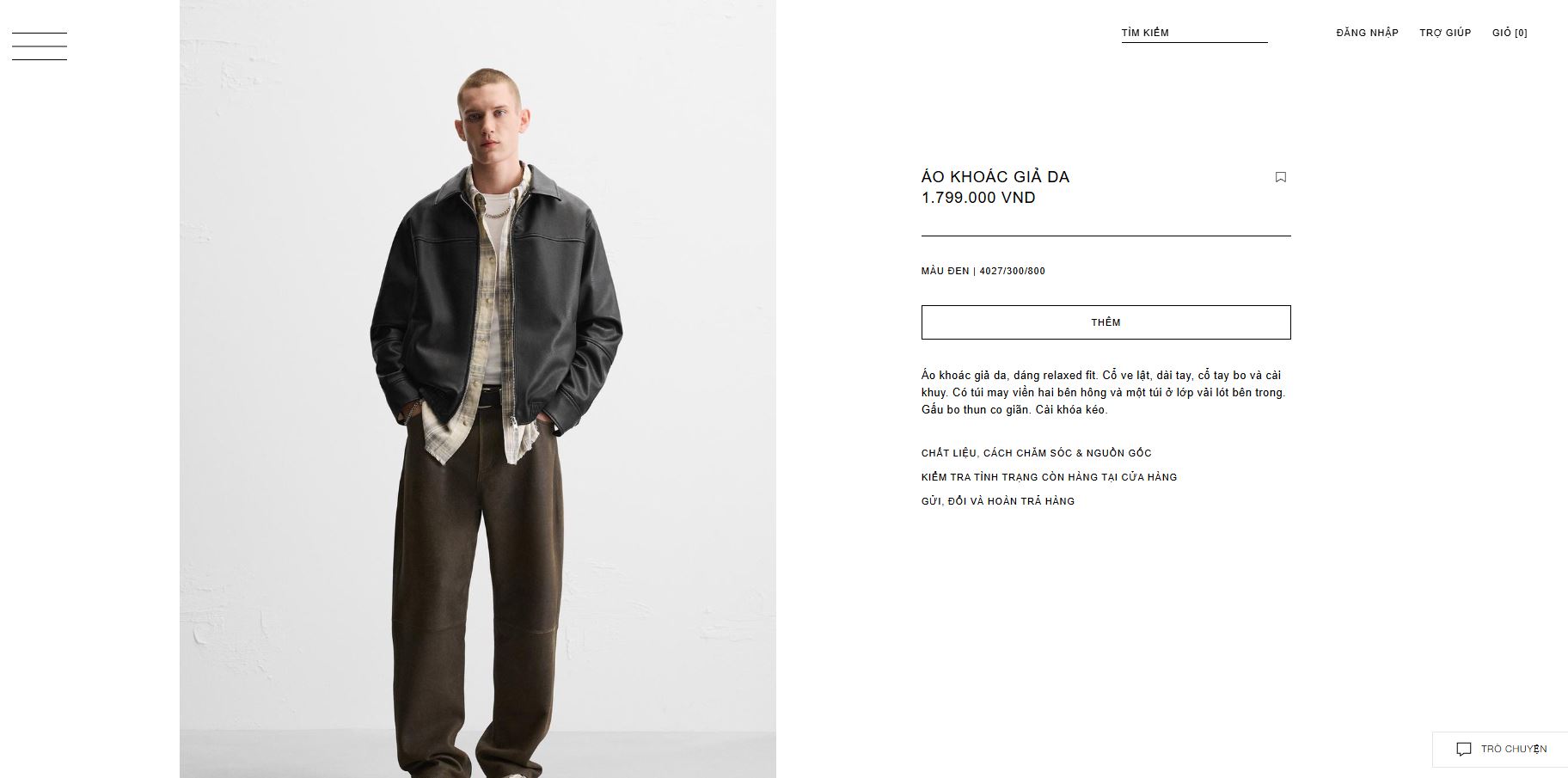 Áo khoác giả da dáng relaxed fit. Cổ ve lật, dài tay, cổ tay bo và cài khuy. Có túi may viền 2 bên hông và một túi ở lớp vải lót bên trong. Gấu bo thun co giãn, cài khóa kéo.