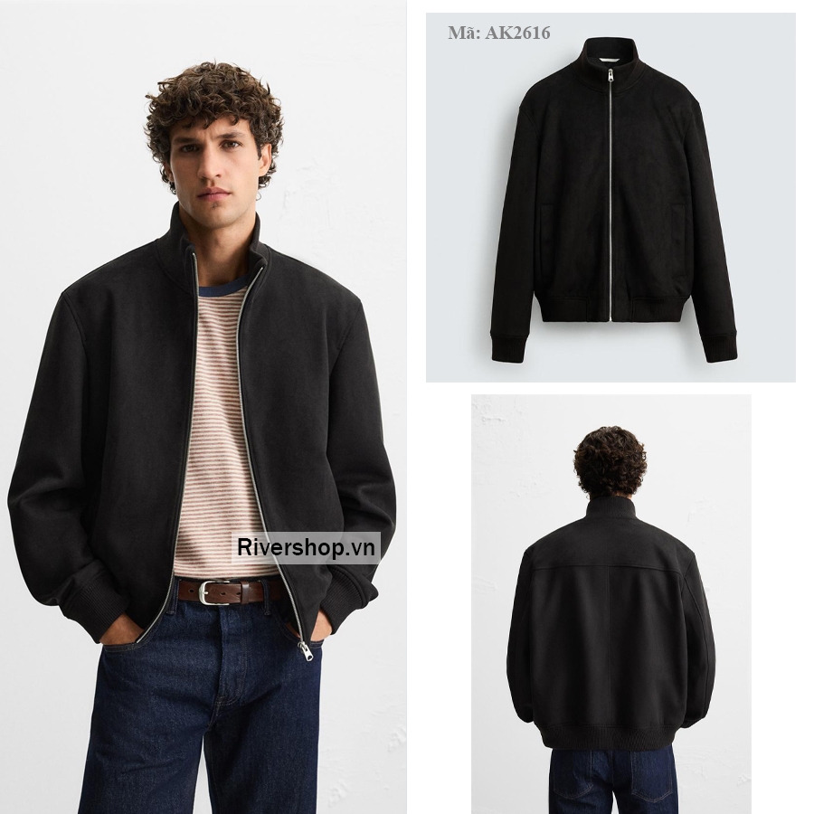 Áo khoác dáng regular fit làm từ vải giả da lộn. Cổ cao có gân chun và tay dài. Túi bo ở hông. Gấu bo gân. Khóa kéo phía trước.