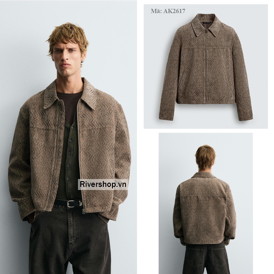 Áo khoác dáng suông, may bằng vải dệt vân nổi. Cổ ve lật và tay dài, cổ tay áo cài khuy. Túi viền hai bên hông. Cài khóa kéo phía trước.