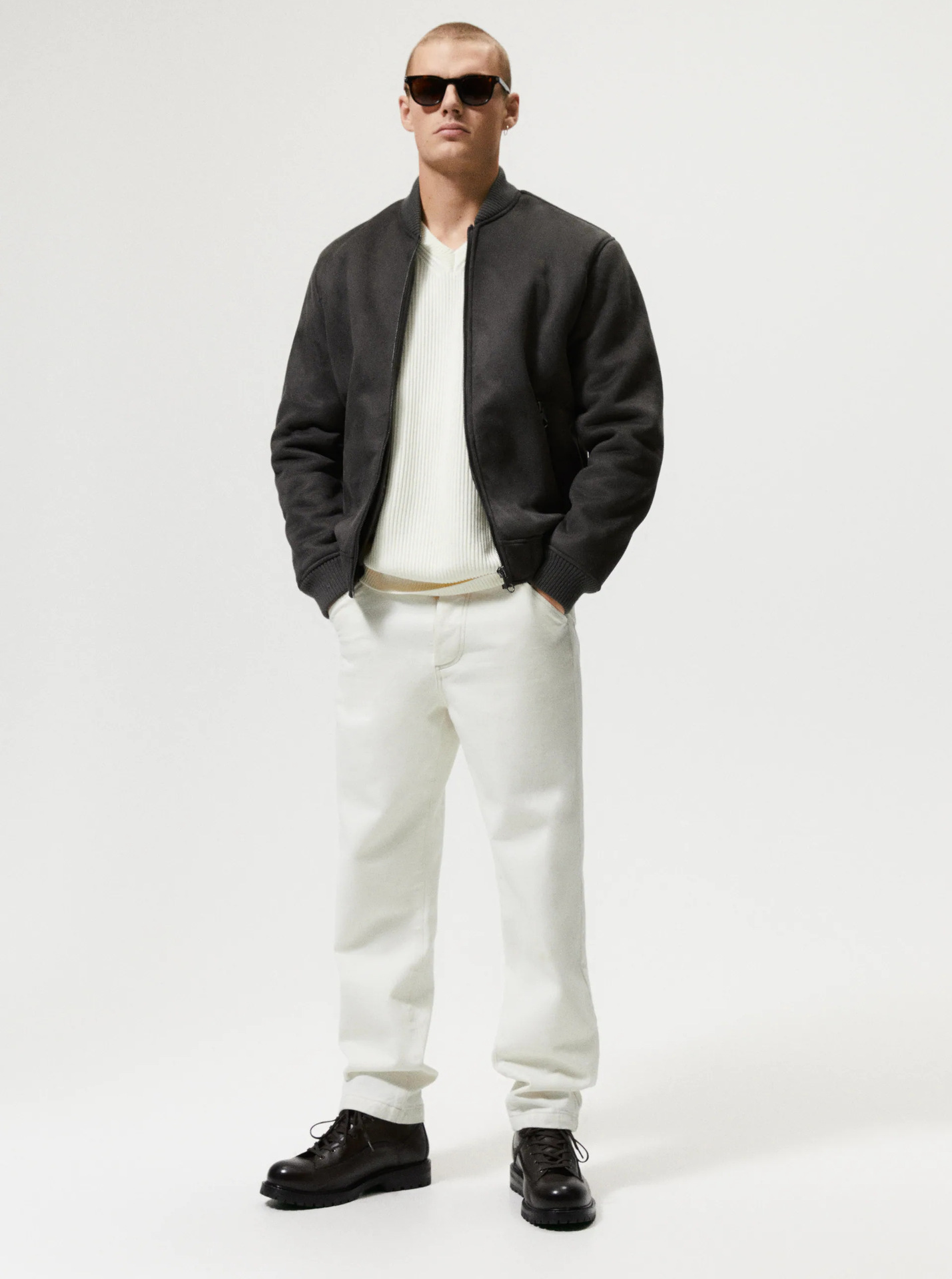 - Form áo regular-fit rộng rãi thoải mái, túi áo có khóa, cổ và tay áo thiết kế bo dạng bomber.