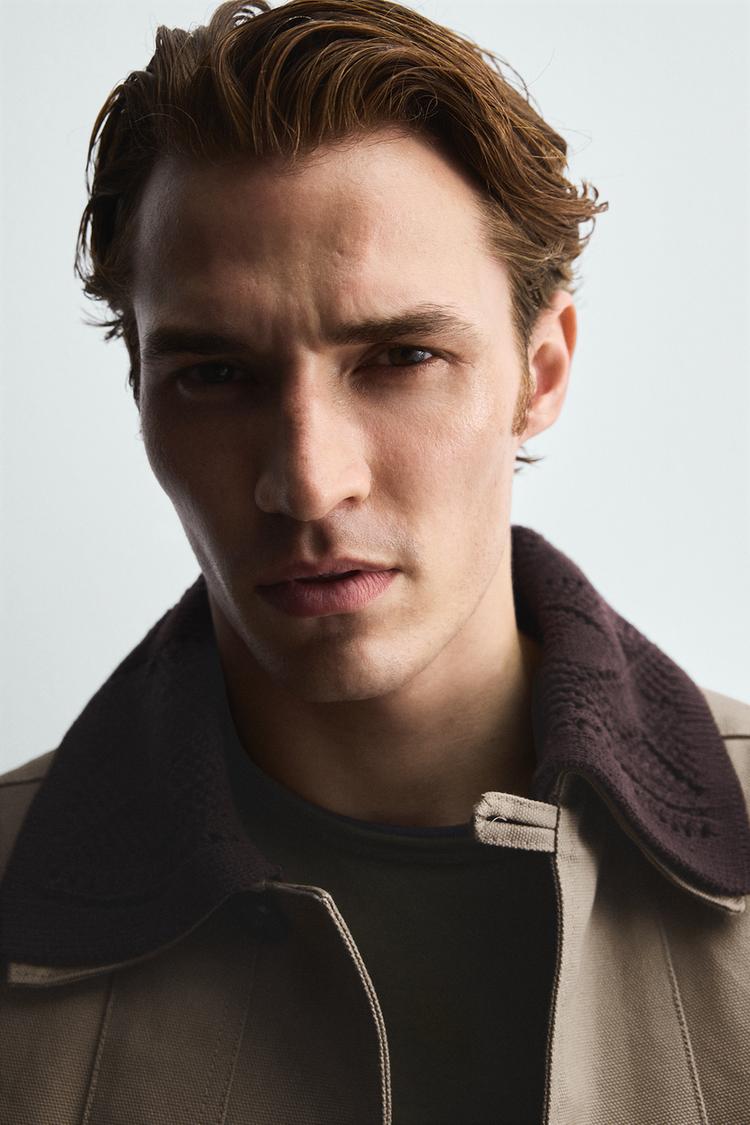Áo khoác vải dệt canvas sợi cotton, dáng relaxed fit. Cổ ve lật phối len móc khác màu và có thể tháo rời. Dài tay, cổ tay may đai cài để điều chỉnh. Có túi may viền hai bên hông. Cài phía trước bằng hàng khuy cài.