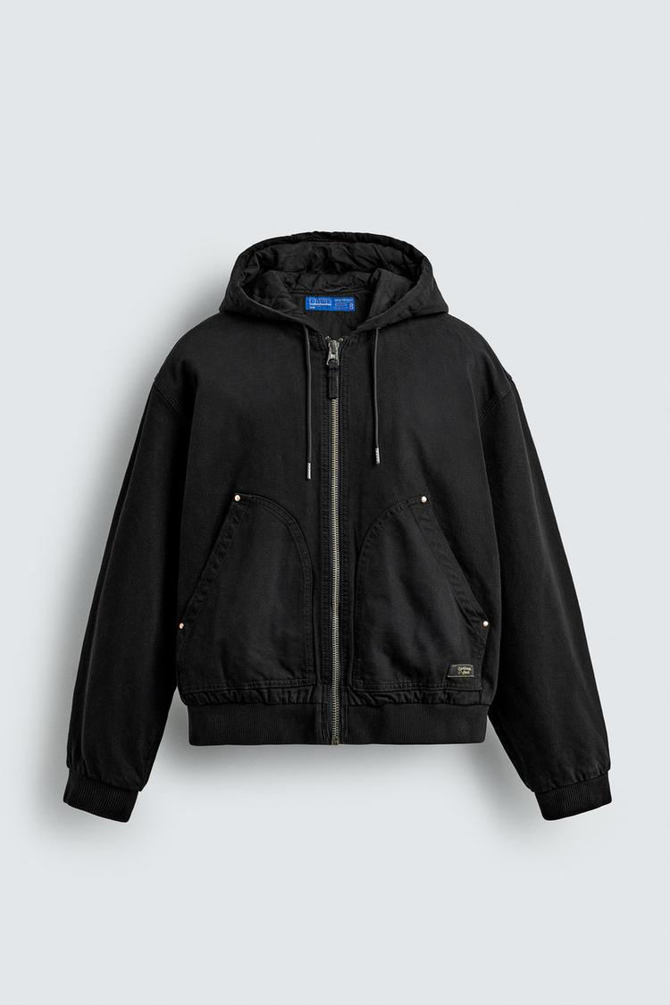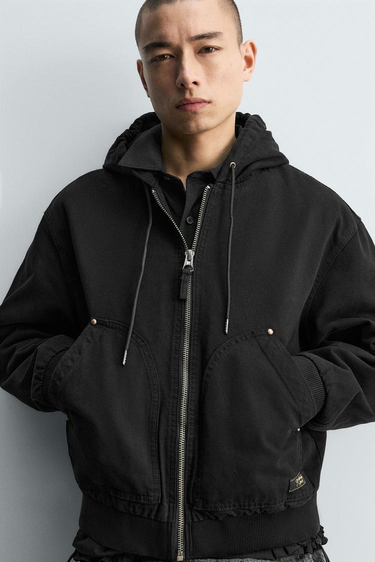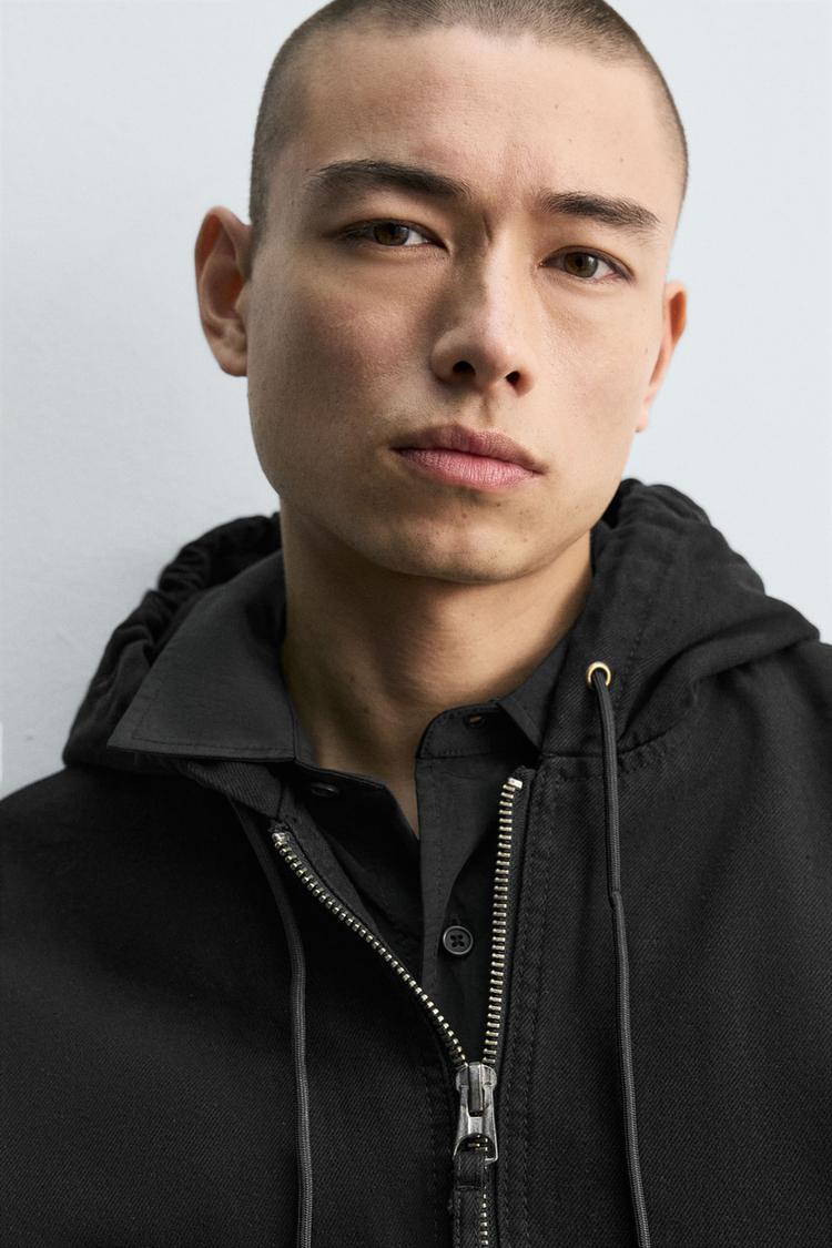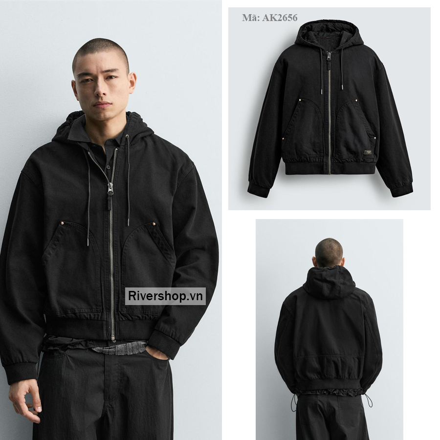 Áo khoác dáng rộng, được may bằng vải cotton chần bông bên trong. Cổ có mũ trùm đầu điều chỉnh được. Dài tay. Có hai túi kiểu kangaroo phía trước. Hiệu ứng bạc màu. Viền bo gân. Hiệu ứng bạc màu. Cài phía trước bằng khóa kéo.