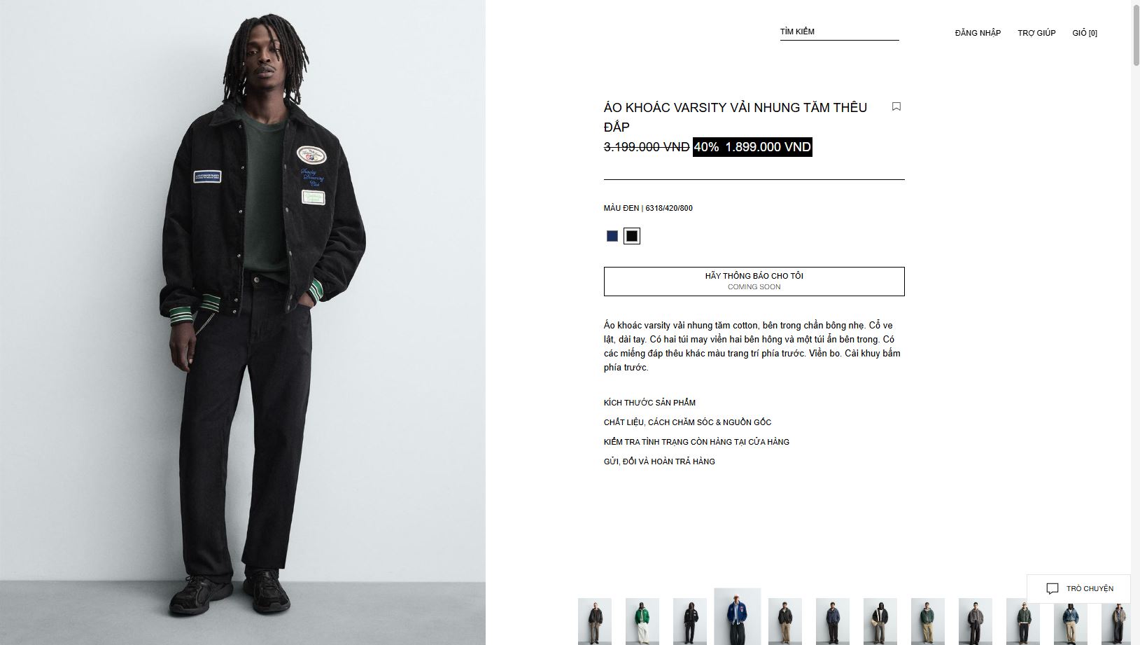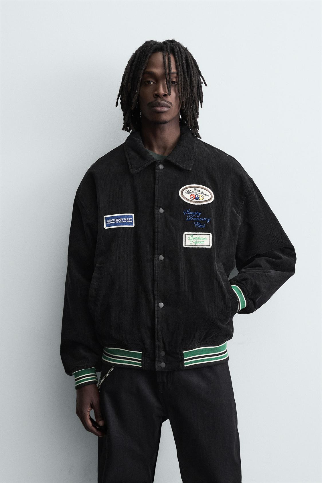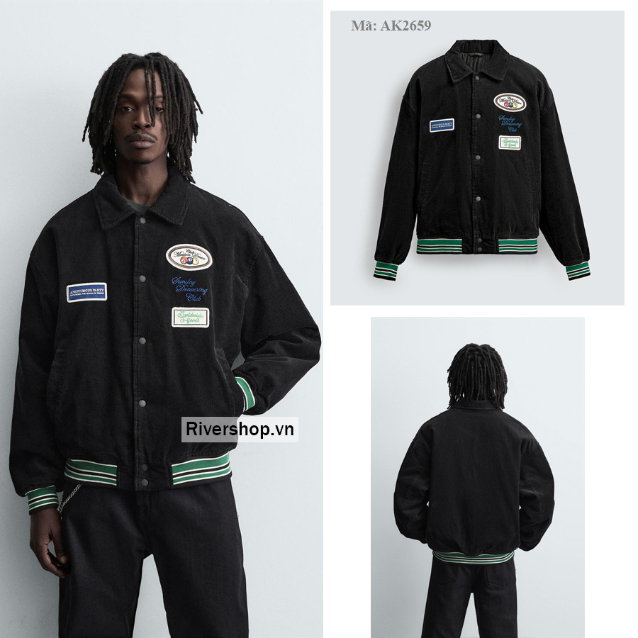 Áo khoác varsity vải nhung tăm cotton, bên trong chần bông nhẹ. Cổ ve lật, dài tay. Có hai túi may viền hai bên hông và một túi ẩn bên trong. Có các miếng đáp thêu khác màu trang trí phía trước. Viền bo. Cài khuy bấm phía trước.