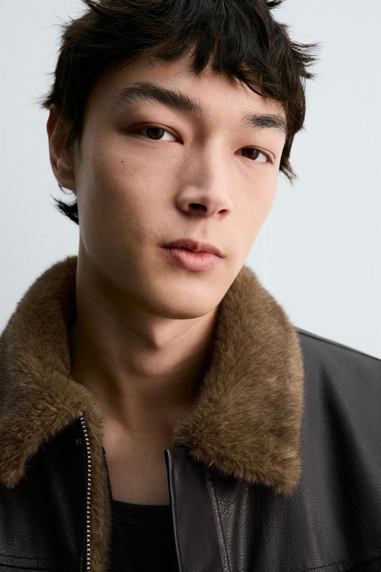 Áo khoác dáng lửng được làm từ vải giả da. Cổ ve lật, có lớp lông. Dài tay. Có túi may viền hai bên hông. Kết thúc bằng bo thun. Cài khóa kéo ẩn phía trước bằng nẹp có khuy bấm.