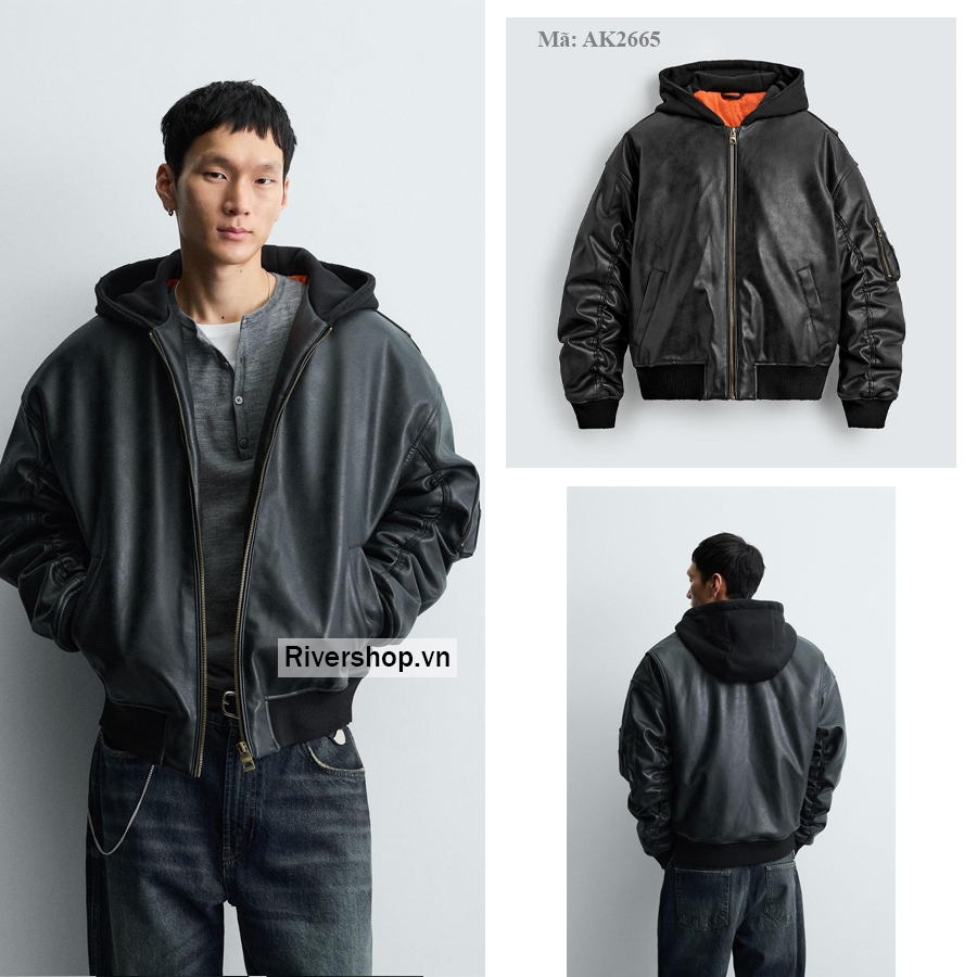 Áo khoác dáng rộng làm từ vải giả da, chần bông bên trong. Cổ có mũ trùm đầu và dài tay. Túi may viền ở hông và một túi bên trong. Gấu áo bo gân. Cài phía trước bằng khóa kéo.