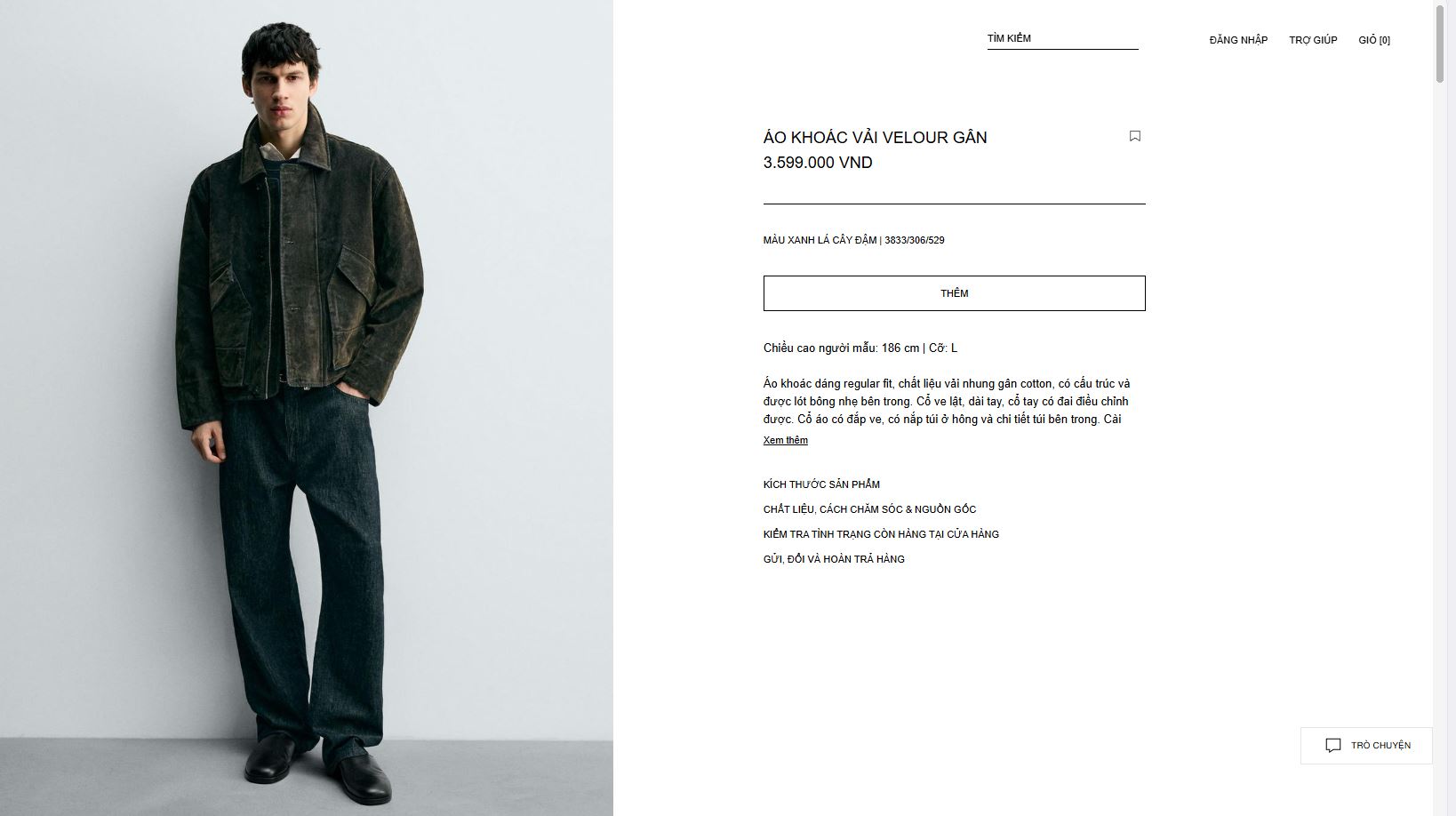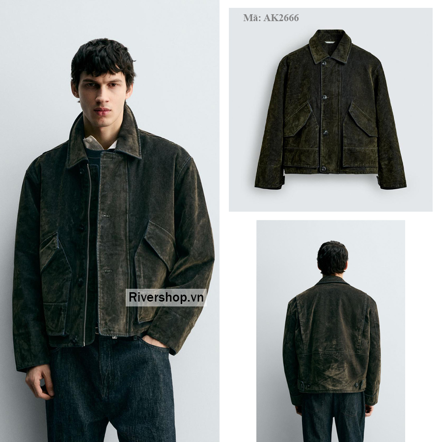 Áo khoác dáng regular fit, chất liệu vải nhung gân cotton, có cấu trúc và được lót bông nhẹ bên trong. Cổ ve lật, dài tay, cổ tay có đai điều chỉnh được. Cổ áo có đắp ve, có nắp túi ở hông và chi tiết túi bên trong. Cài khóa kéo ẩn phía trước bằng nắp có khuy.