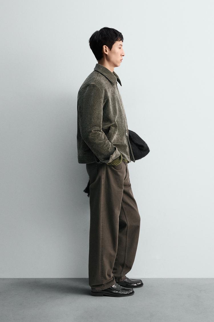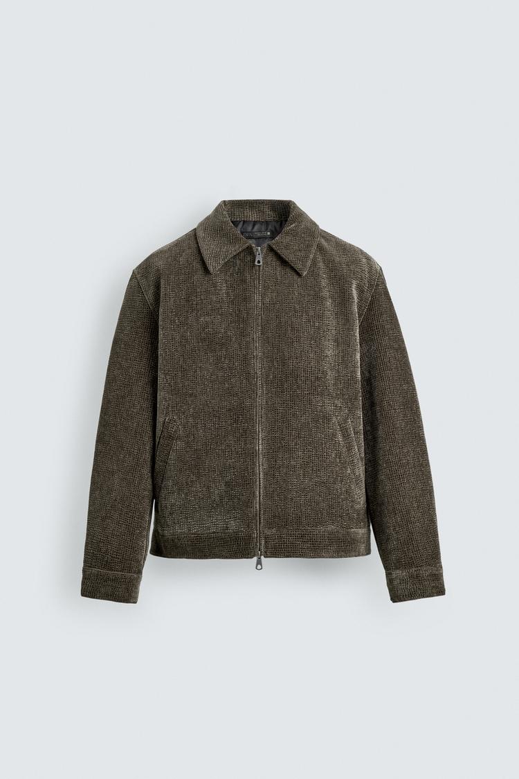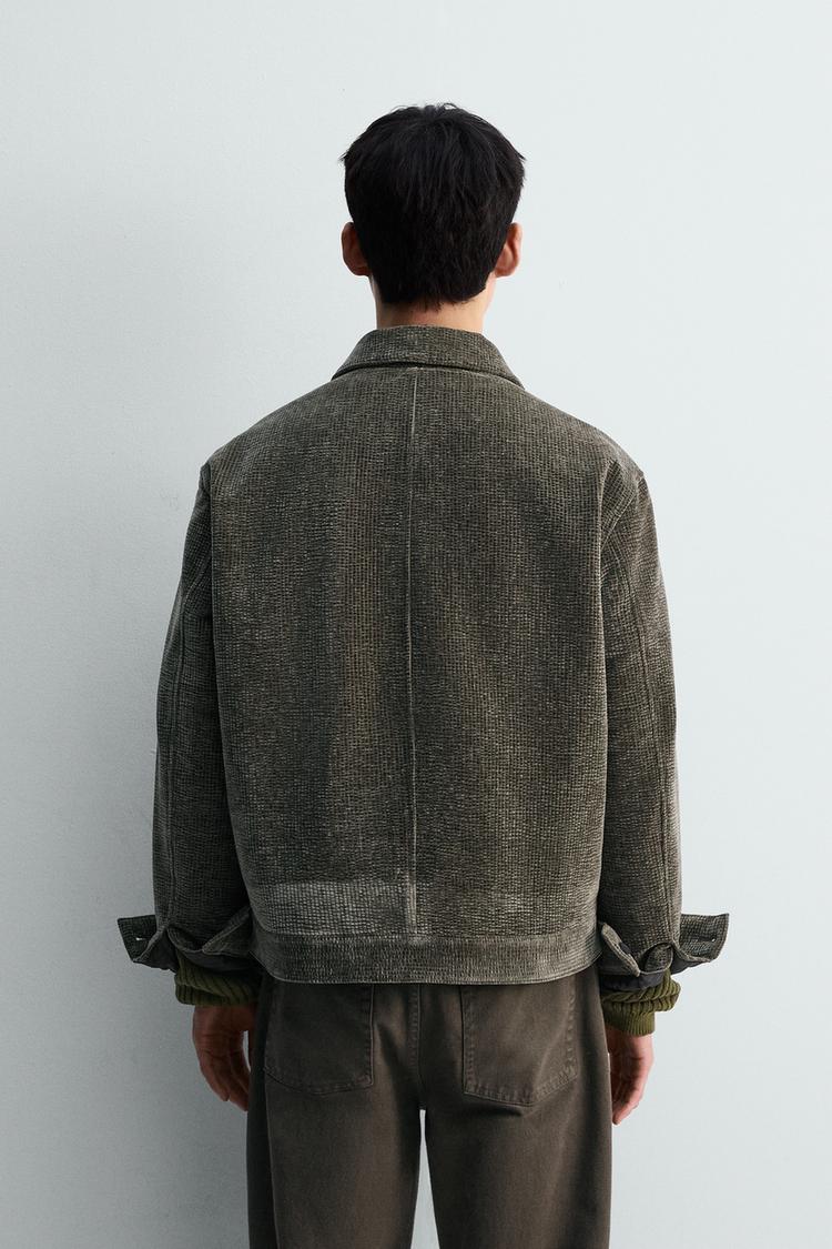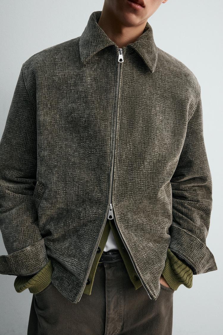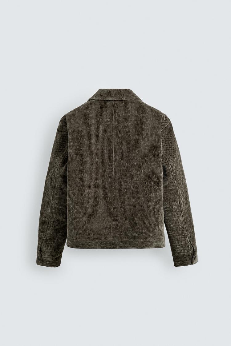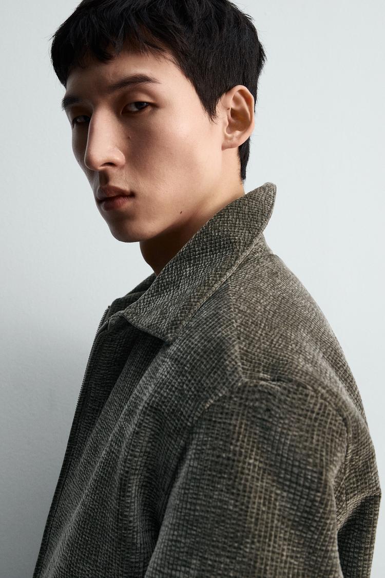 Áo khoác dáng rộng làm từ vải nhung tăm cotton. Cổ ve lật, dài tay, cổ tay cài khuy. Có túi may viền hai bên hông và một túi ở lớp vải lót bên trong. Cài khóa kéo phía trước.