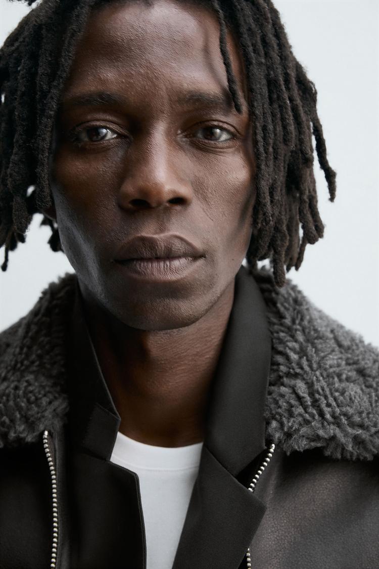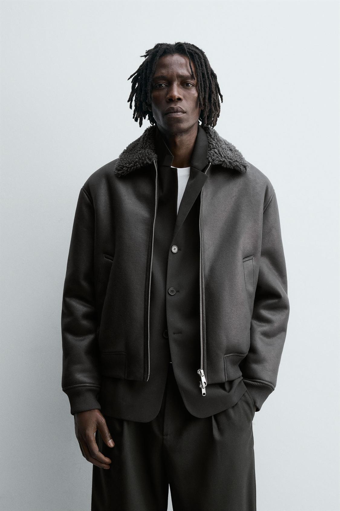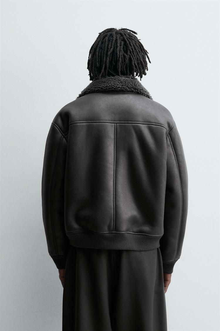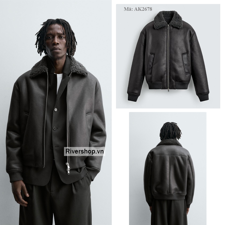 Áo khoác dáng rộng làm từ vải giả da, bên trong lót lông giả kết hợp màu tương phản. Cổ ve lật và dài tay. Có túi may viền hai bên hông. Bo viền vải gân. Cài bằng khóa kéo phía trước.