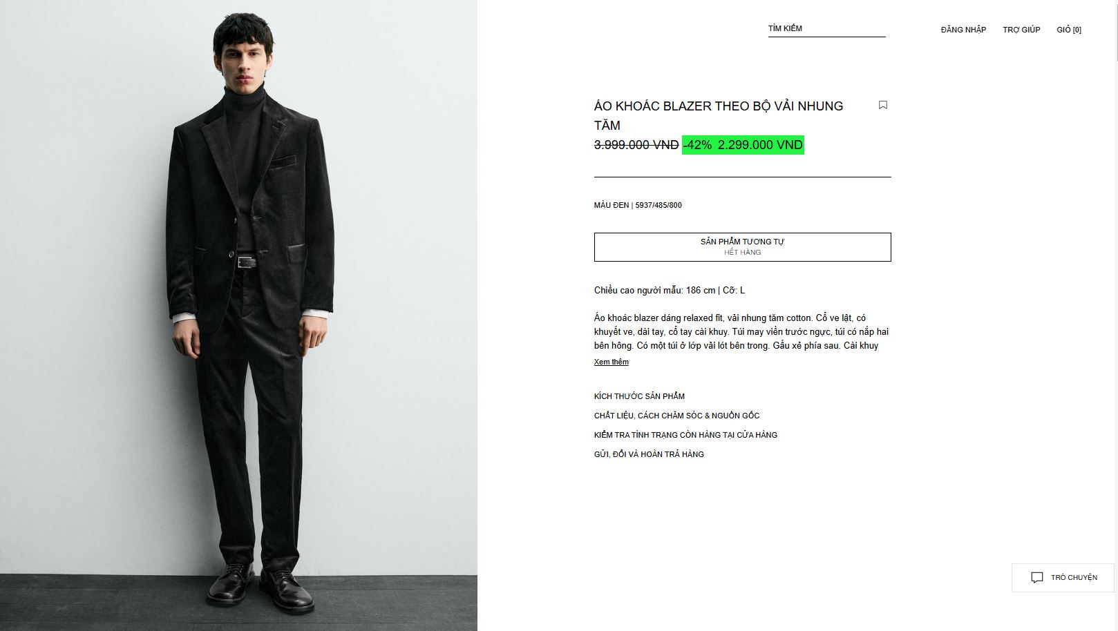 Áo khoác blazer dáng relaxed fit, vải nhung tăm cotton. Cổ ve lật, có khuyết ve, dài tay, cổ tay cài khuy. Túi may viền trước ngực, túi có nắp hai bên hông. Có một túi ở lớp vải lót bên trong. Gấu xẻ phía sau. Cài khuy phía trước.