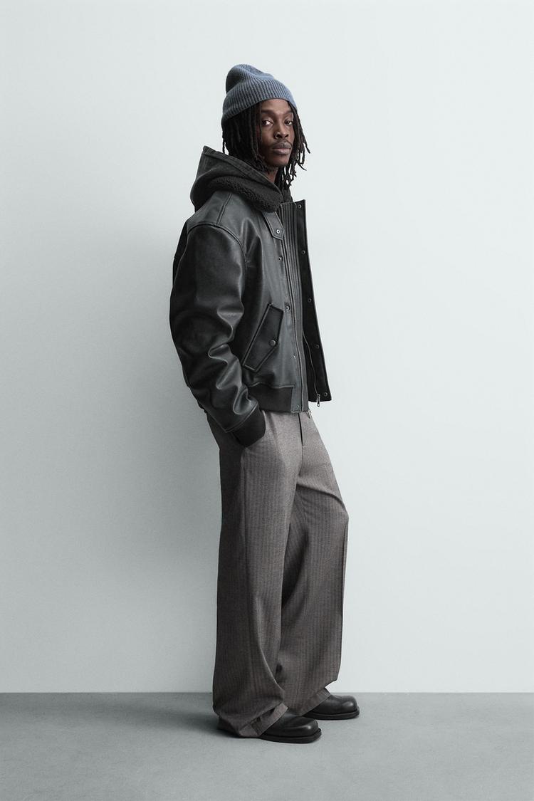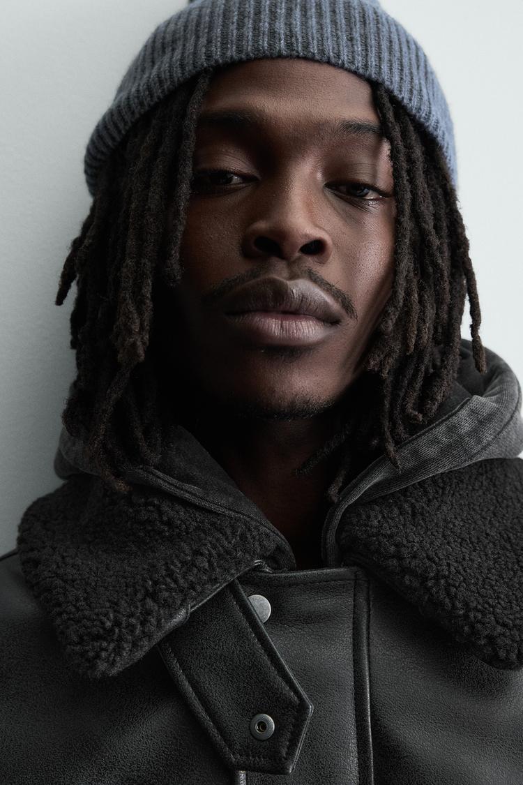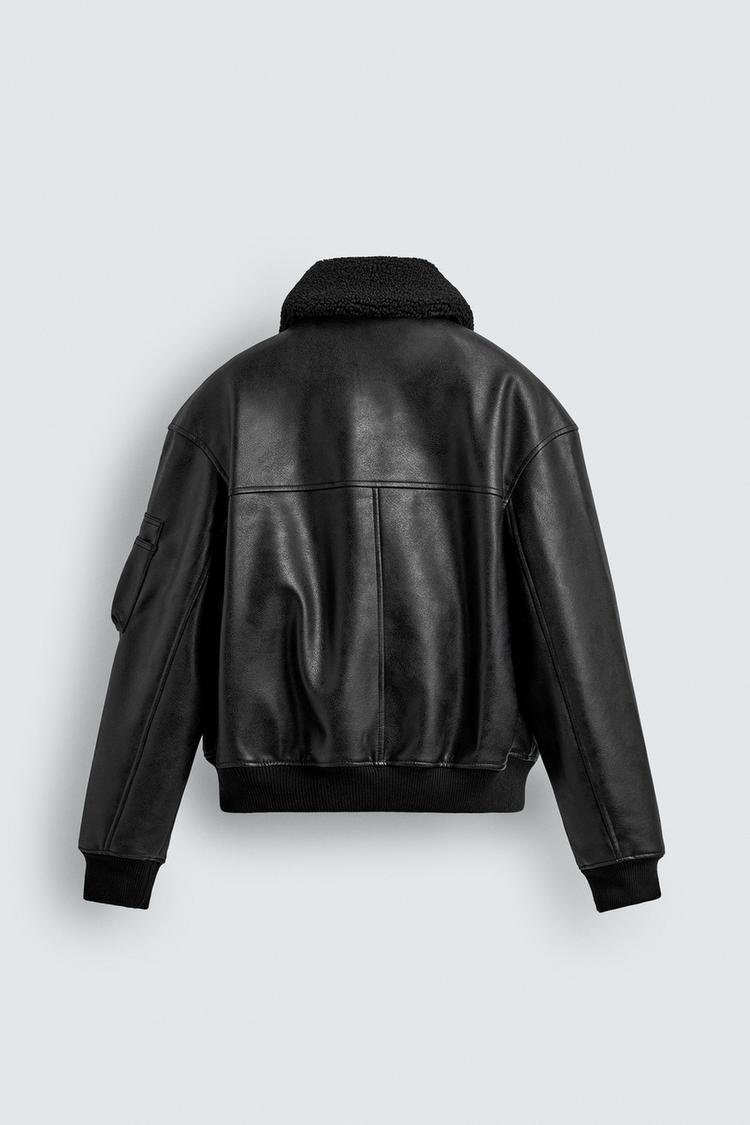 Áo khoác dáng rộng làm từ vải giả da. Cổ ve lật giả lông có thể tháo rời bằng khuy cài. Tay dài. Có túi có nắp ở hông và chi tiết túi bên trong. Viền bo gân. Cài phía trước bằng khóa kéo ẩn dưới nắp che có khuy bấm.
