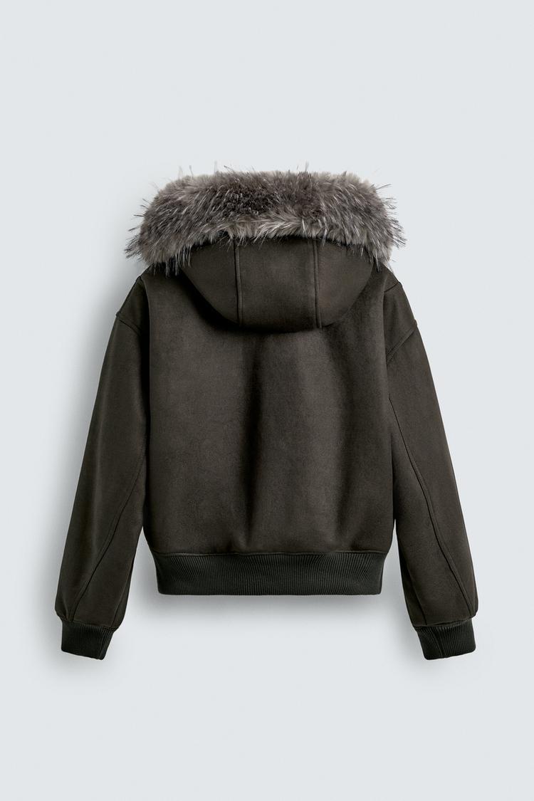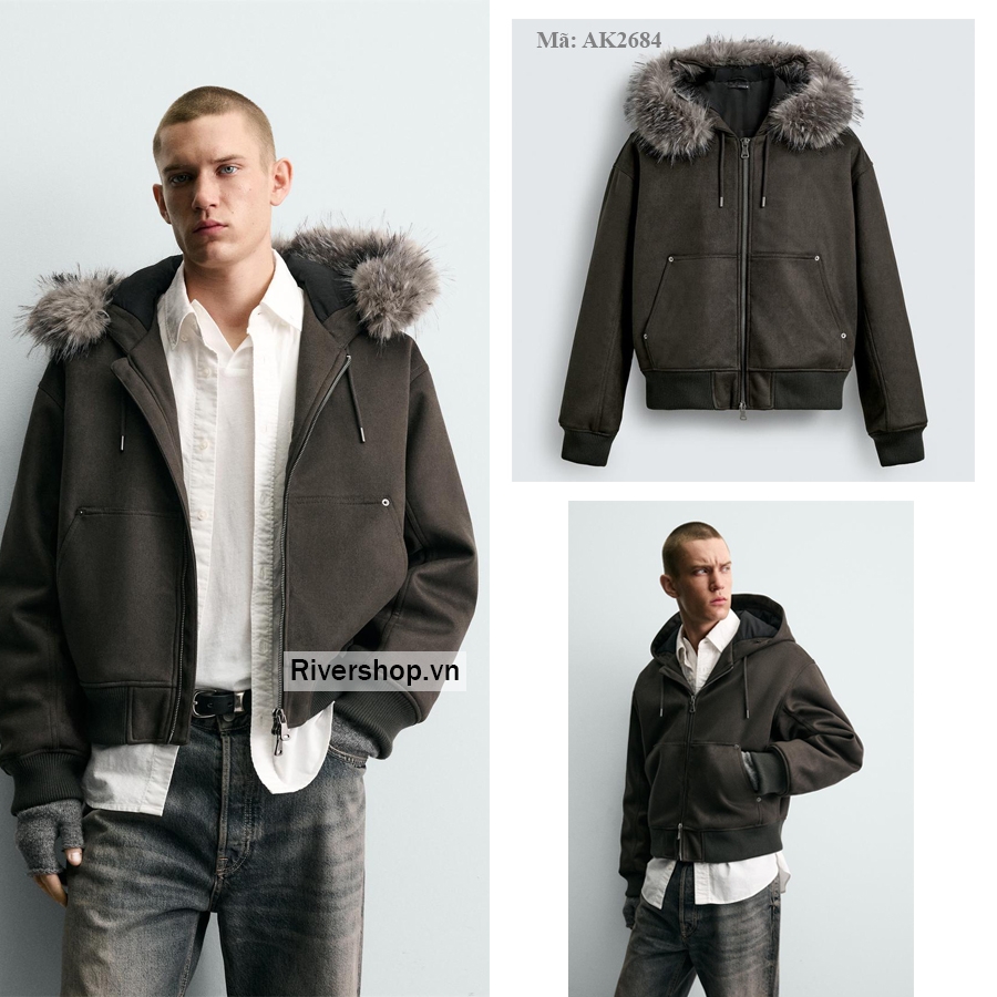 Áo khoác dáng lửng, may từ vải giả da lộn chần bông bên trong. Cổ có mũ trùm đầu điều chỉnh được, viền dây giả lông tháo rời. Dài tay. Túi kangaroo phía trước và túi bên trong. Gấu áo bo thun co giãn. Cài bằng khóa kéo ở phía trước.
