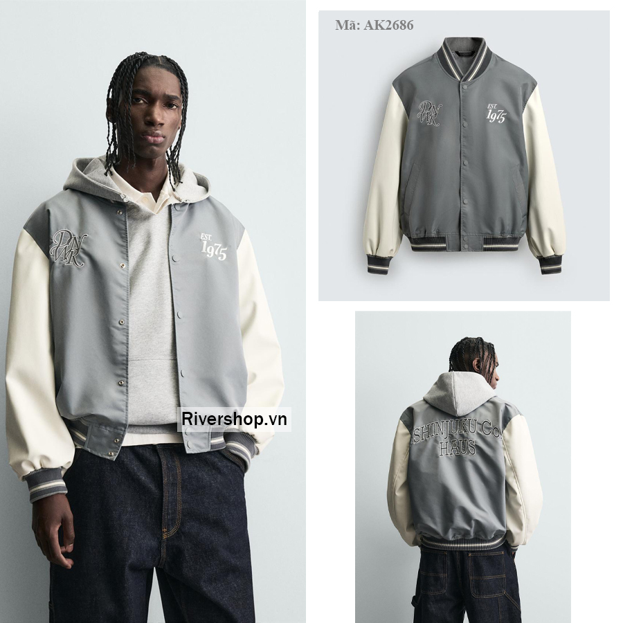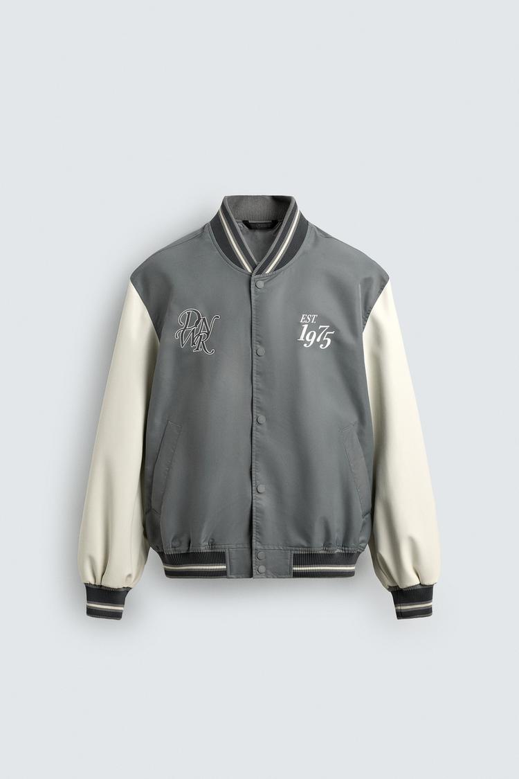 Áo khoác varsity vải kỹ thuật phối hiệu ứng da. Cổ áo bo gân co giãn, dài tay. Túi may viền hai bên hông và có một túi bên trong. Có thêu họa tiết tương phản ở mặt trước và mặt sau. Bo gân. Cài phía trước bằng nút bấm.
