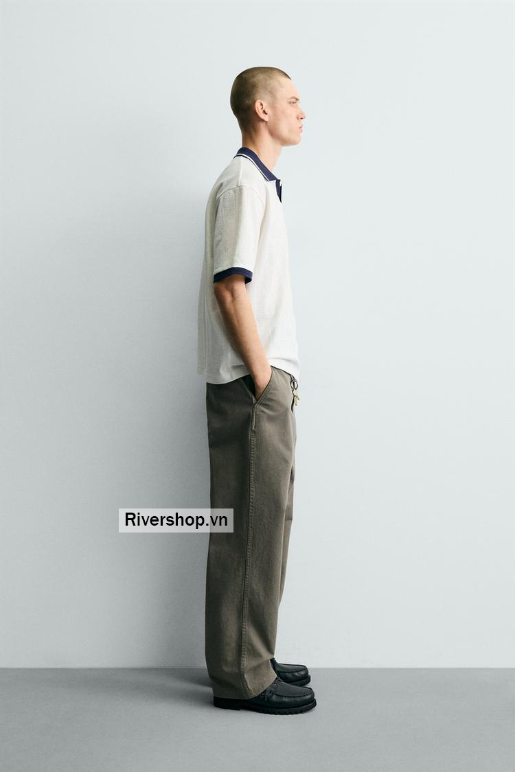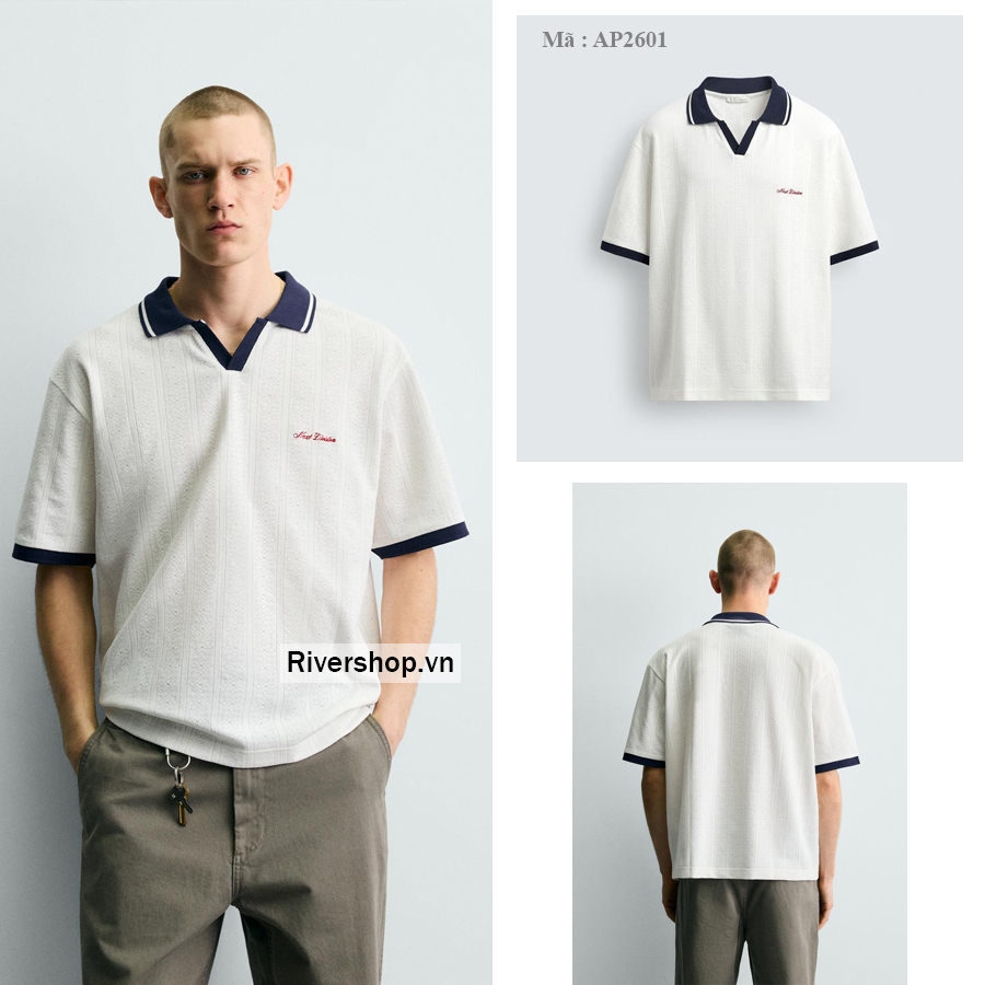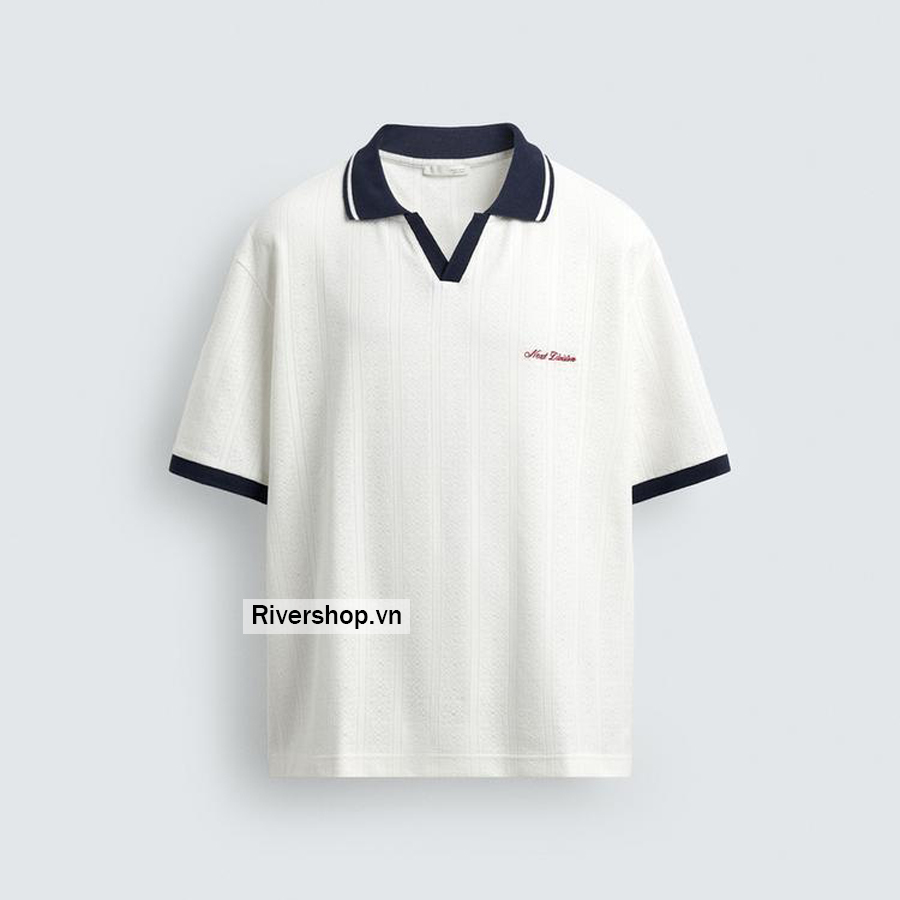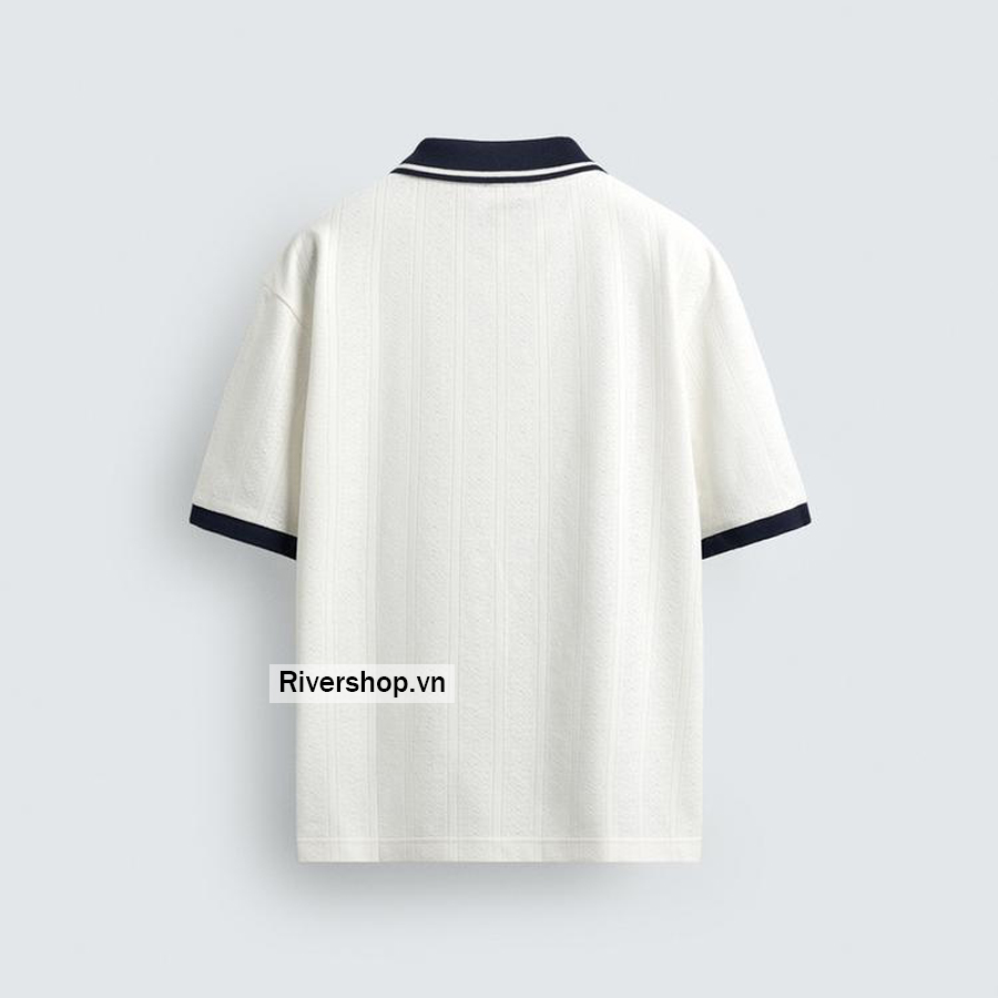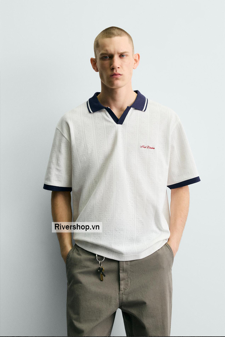 Áo polo phom rộng rãi. Cổ ve lật, xẻ phía trước. Cộc tay. Phối màu tương phản với chữ thêu phía trước. Viền bo gân phối màu tương phản.