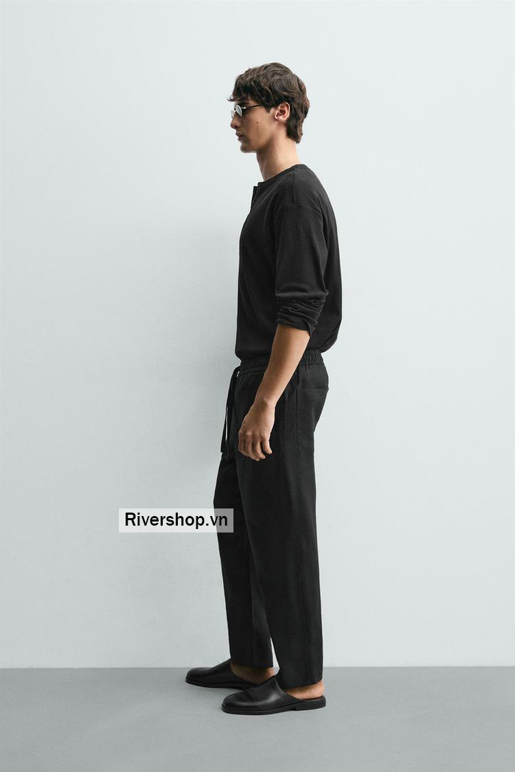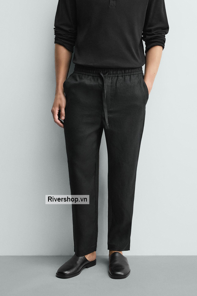 Quần relaxed fit làm từ vải linen. Cạp quần co giãn có dây rút điều chỉnh. Có túi phía trước và túi đắp phía sau.