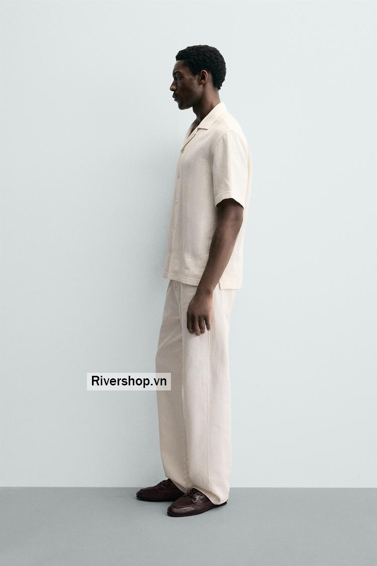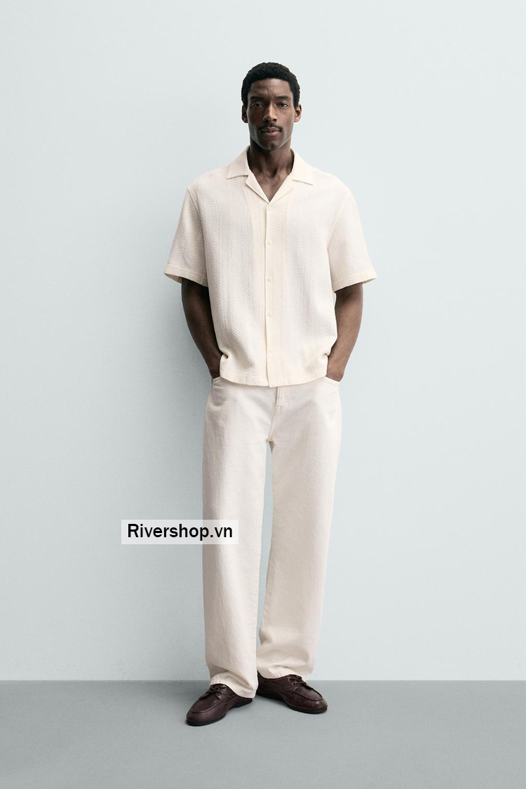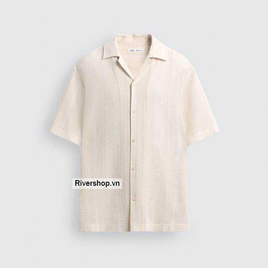 Áo sơ mi dáng relaxed fit, được làm từ vải pha cotton. Cổ ve nhọn khoét chữ K và tay ngắn. Gấu áo xẻ hai bên. Cài khuy phía trước.